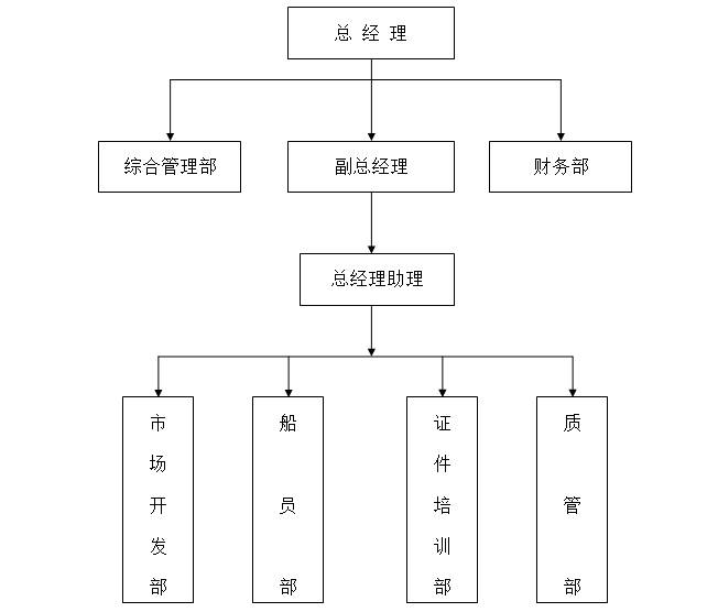 公司為了更好服務(wù)于船員和航運(yùn)企業(yè)、相關(guān)合作單位等,廈門海盈海運(yùn)特設(shè)立了總經(jīng)理直轄管理的副總經(jīng)理( 崗位)及綜合管理部、財(cái)務(wù)部等,同時設(shè)立總經(jīng)理——副總經(jīng)理——總經(jīng)理助理順序垂直管理的四個職能 部門:市場開發(fā)部、船員部、證件培訓(xùn)部、質(zhì)管部,為船員服務(wù)管理業(yè)務(wù)和其他業(yè)務(wù)提供有力的人力資 源和對口崗位保障。組織機(jī)構(gòu)圖如下: