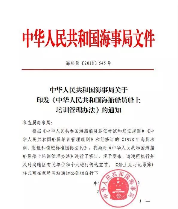 各直屬海事局: 根據(jù)《中華人民共和國海船船員適任考試和發(fā)證規(guī)則》《中華人民共和國船員培訓(xùn)管理規(guī)則》和經(jīng)修訂的《1978 年海員培訓(xùn)、發(fā)證和值班標(biāo)準(zhǔn)國際公約》,我局對(duì)《中華人民共和國海船船員船上培訓(xùn)管理辦法》進(jìn)行了修訂,現(xiàn)予發(fā)布,請(qǐng)遵照?qǐng)?zhí)行并及時(shí)向轄區(qū)有關(guān)單位和個(gè)人進(jìn)行傳達(dá)宣貫。《船上見習(xí)記錄簿》樣式可在我局網(wǎng)站通知公告欄自行下載。